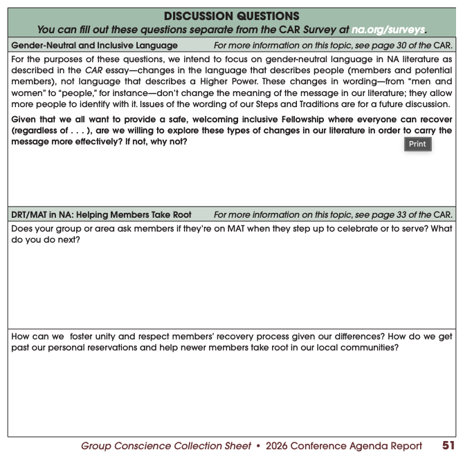 The purpose of this form is for Groups of the Greater New York Region of Narcotics Anonymous to provide the Delegate Team with their vote on the motions put forth by the World Board for the 2026 World Service Conference Agenda Report Electronic Tally Sheet.