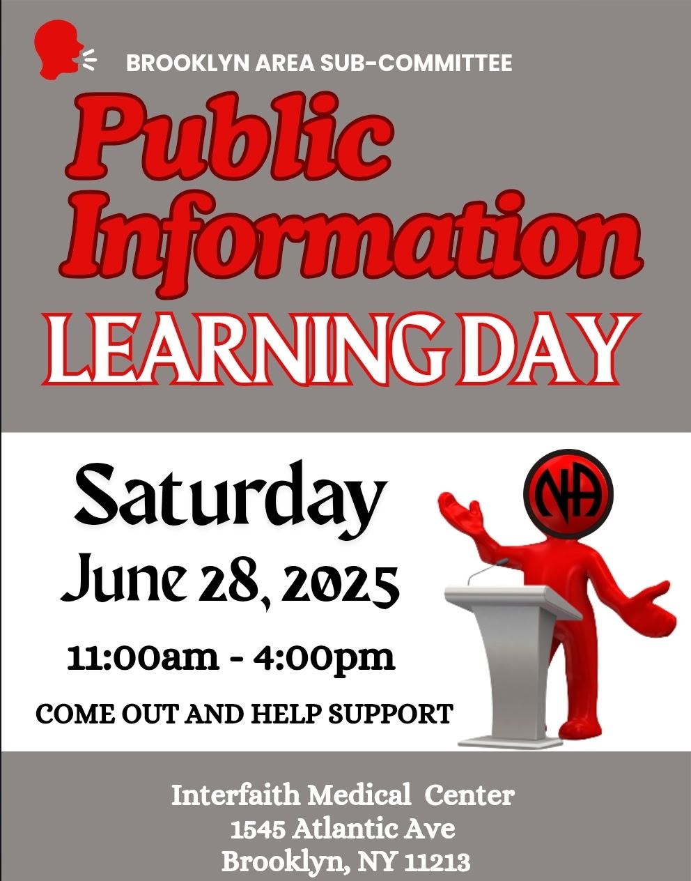 Interfaith Medical Center, 1545 Atlantic Ave, Brooklyn, NY 11213 Come out and support the Brooklyn Area for it’s Public Information Learning Day. See attached flier.