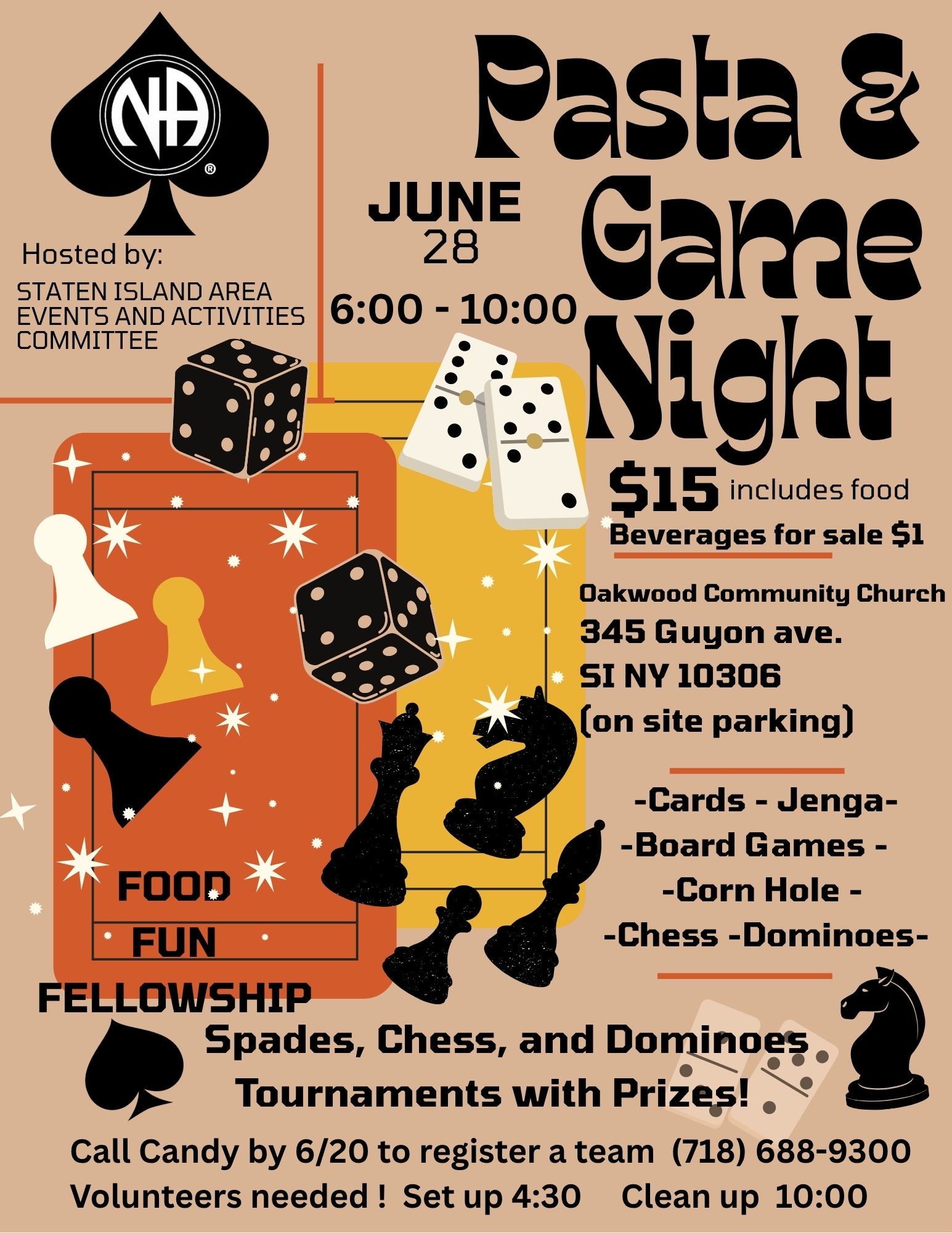 Oakwood Community Church, 345 Guyon ave. SI NY 10306 (on site parking). Pasta & Game Night! Cards, Jenga, board games, chess, dominoes, and corn hole. Tournaments with prizes. $15.00 food included. Beverages for sale $1.00. Call Candy by June 20th to register a team (718) 688-9300. Volunteers needed, set up 4:30 pm